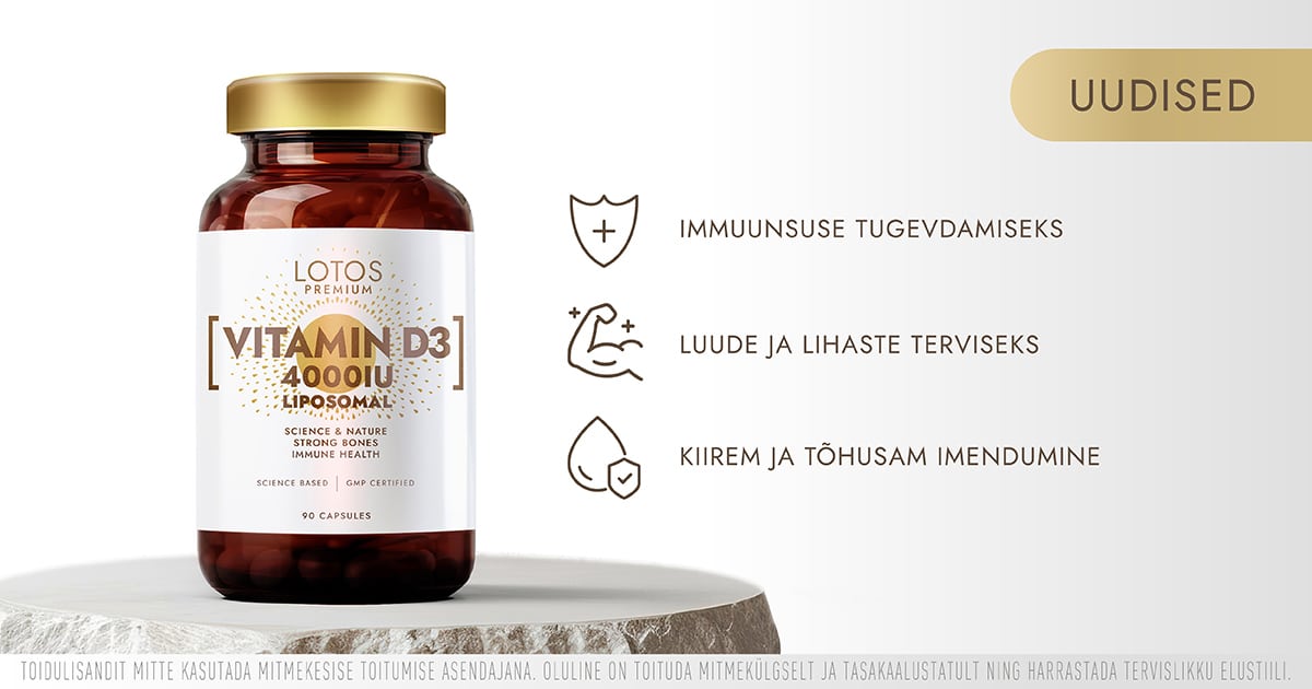 LOTOS PREMIUM Liposoomne D3-vitamiin 4000IU sisaldab D-vitamiini, mis aitab hoida luid ja lihaste talitlust normaalsena, samuti toetab immuunsüsteemi normaalset talitlust.