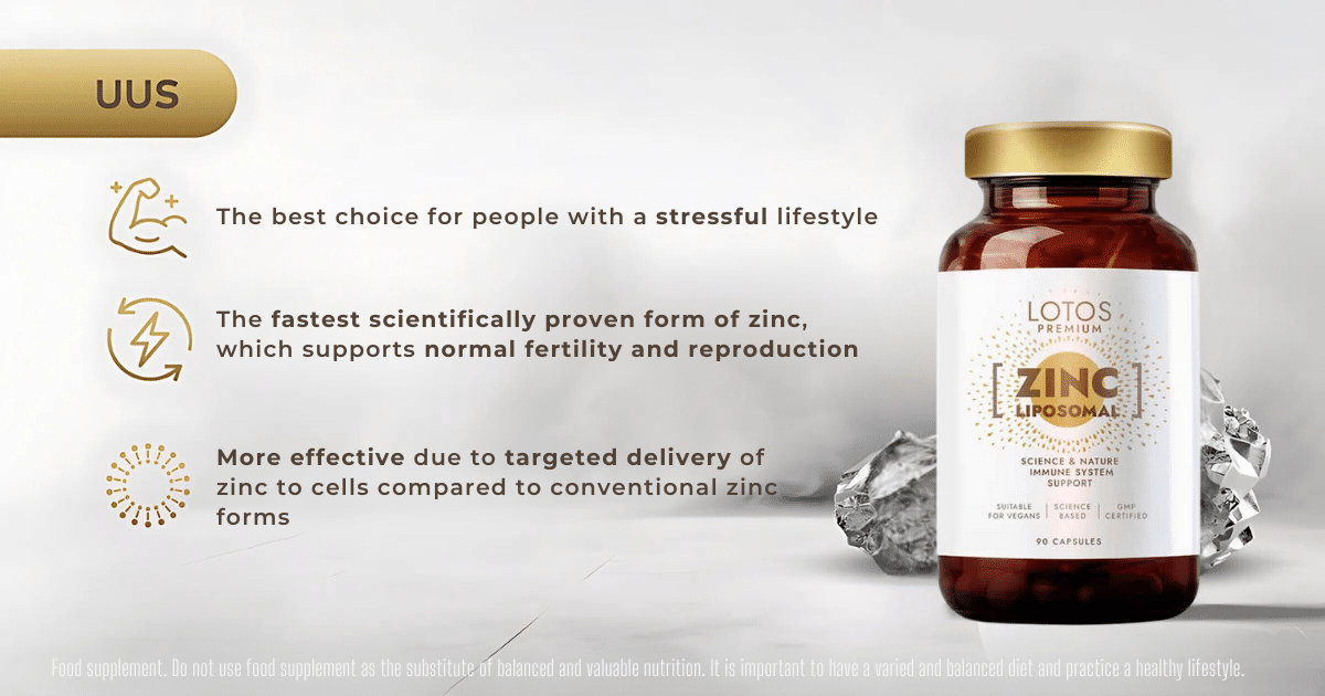 LOTOS PREMIUM Liposomal ZINC containing zinc contributes to normal carbohydrate metabolism, normal cognitive function, normal function of the immune system, normal protein synthesis, normal fertility and reproduction. Zinc contributes to the maintenance of normal testosterone levels in the blood, as well as the maintenance of normal bones, hair and nails.