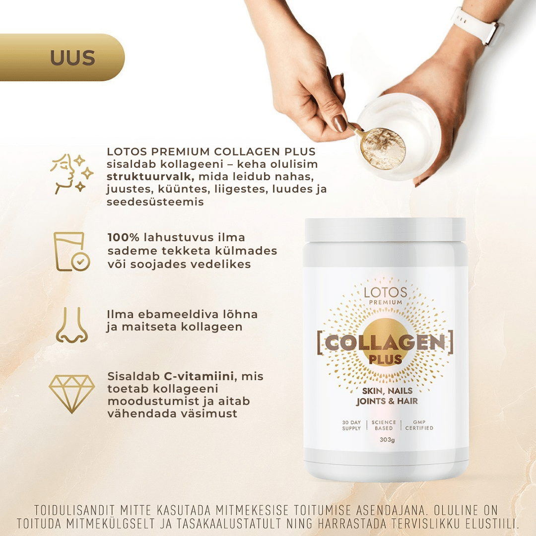 LOTOS PREMIUM COLLAGEN PLUS sisaldab kollageeni, mis on inimkeha kõige olulisem struktuurvalk, mida leidub nahas, juustes, küüntes, sidemetes, kõõlustes, luudes, kõhrkoes, seedesüsteemis, kardiovaskulaarsüsteemis. Vitamiin C aitab kaasa kollageeni normaalsele moodustumisele naha, veresoonte, luude ja kõhrkoe normaalseks talitluseks; aitab kaasa normaalsele energiavahetusele ja samuti aitab vähendada väsimust ja kurnatust.